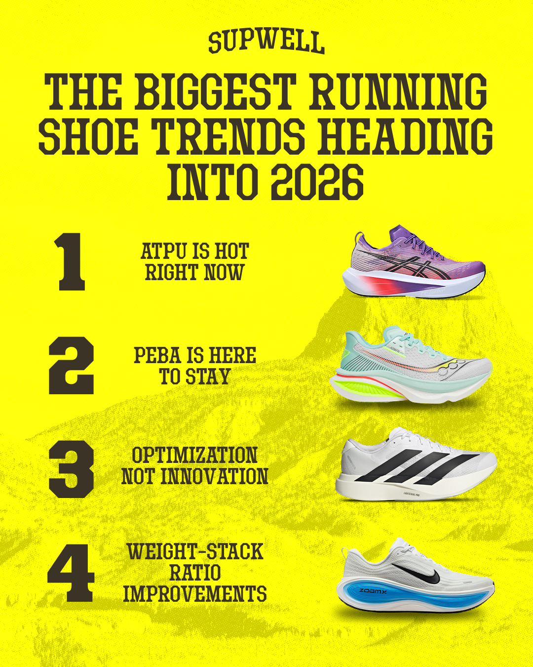 As 2025 comes to an end, we are looking forward to all of the running shoe tech trends we expect to see in 2026. These include 4 specific areas we will be looking out for, including ATPU foams becoming more widespread, the continued use of PEBA foams in different applications, an optimization of some of the current technology, and improvements in the weight of shoes while still keeping the stack heights high. See below for all the details!