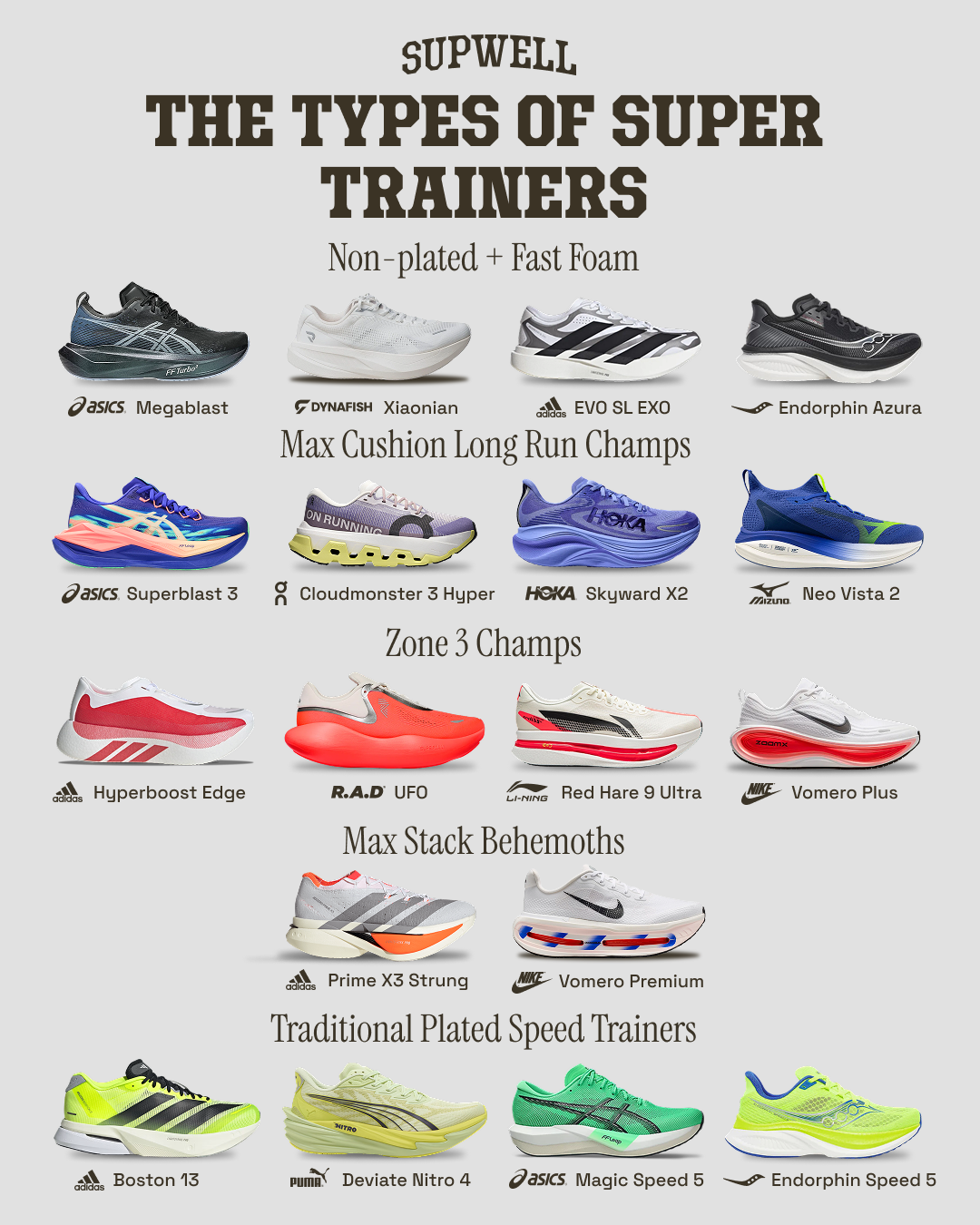 Below we are breaking down the different types of super trainers in the running shoe market. See how we have categorized shoes like the Adidas Hyperboost Edge, ASICS Superblast 3, R.A.D UFO, Dynafish Xiaonin, Li-Ning Red Hare 9 Ultra, On Cloudmonster 3 Hyper, Adidas Evo SL EXO, Hoka Skyward X2, and more.