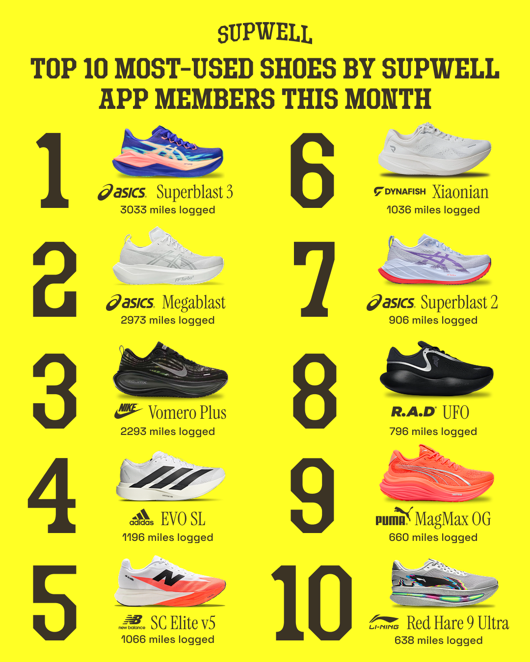This is a real-time look at what hobby joggers in the Supwell community are actually putting miles on right now, from the ASICS Superblast 3 leading the way to the Li-Ning Red Hare 9 Ultra rounding out the top 10. See below for the top 10 most used running shoes in April 2026.